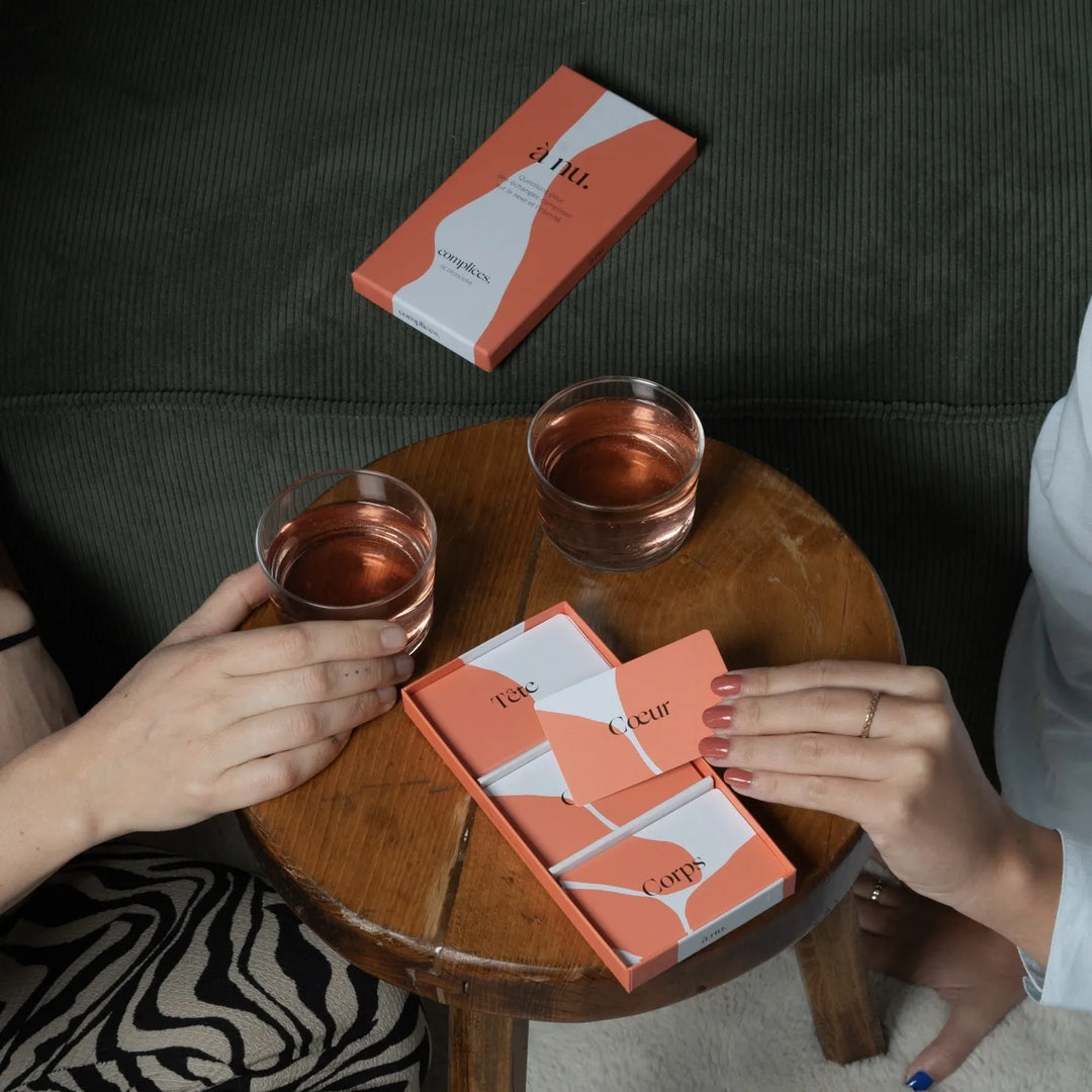 à nu. est une invitation à se rapprocher, par l'échange ou sous la couette. 90 questions pour les histoires naissantes comme pour les plus anciennes, celles sentimentales ou purement physiques, les relations queers, ou les amitiés et plus si affinités... bref, pour toutes les personnes qui couchent ensemble. Ces cartes ne sont toutefois pas le prélude à un instant coquin, mais favorisent des échanges complices sur le sexe et l'intimité. à nu. libère et captive (le corps et l'esprit), révèle les envies au grand jour et rapproche pendant la nuit. Pour oser vous mettre à nu.